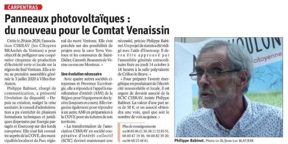 Vaucluse Matin publie un article pour annoncer l’assemblée constitutive de Cibrav du 14 octobre 2021.